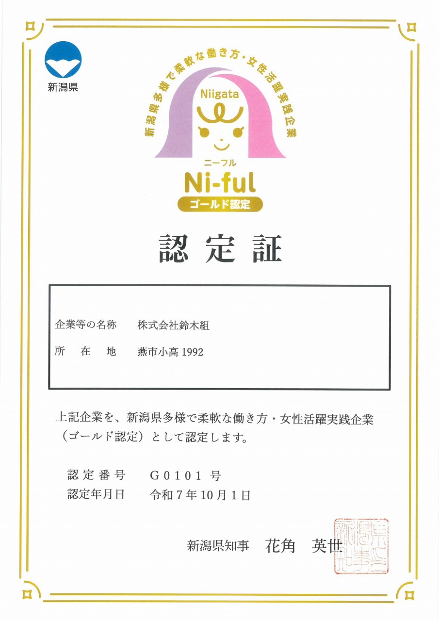NEWSお知らせ Ni-fulゴールド認定企業 登録 2025年10月1日 新潟県多様で柔軟な働き方・女性活躍実践企業認定制度「Ni-ful(二―フル) 」ゴールド認定企業に登録されました。 お知らせ一覧へ >>